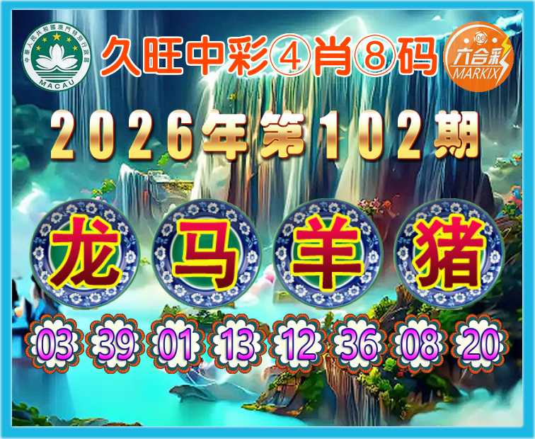 102期: 🍀『久旺中彩』 🍀④肖⑧码🍀【龙马羊猪】开:00准